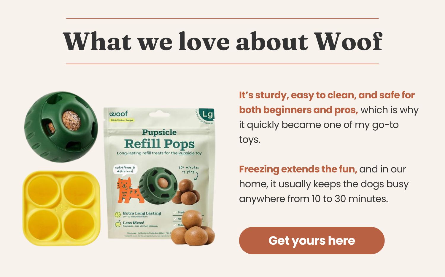A favorite in our house! You can buy their pre-made Pupsicle Pops, use their treat mixes, or get creative and make your own with the DIY mold.I like to add a little water to the ingredients to create the perfect pupsicle — it keeps my dogs working on it for much longer.