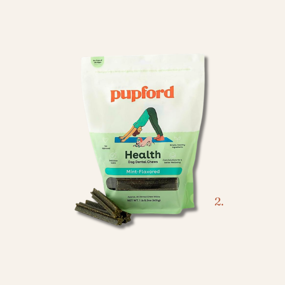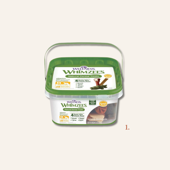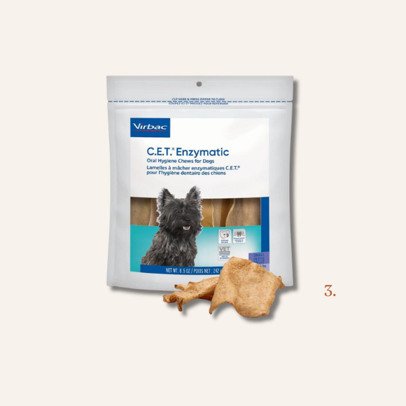 There are various brand options available formulated specifically for teeth cleaning and endorsed by the AVDC (American Veterinary Dental College). Our personal favorite is Whimzees for their ingredient list and price point. These are a great option for dogs that struggle with various protein allergies or sensitivities. Our dogs also like the dental chews from Pupford. Veterinarians often carry and recommend Vibrac dental chews.