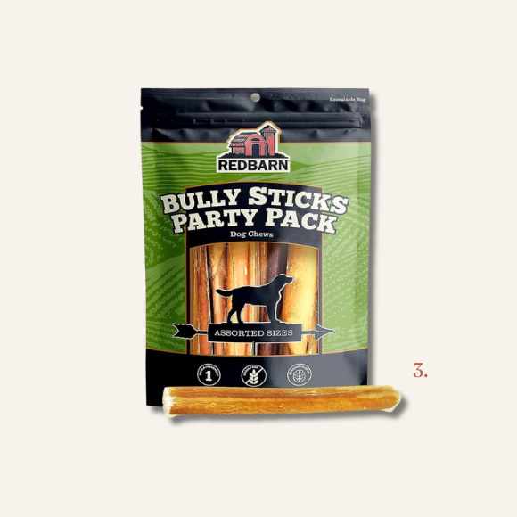 A great rawhide alternative! These are long-lasting (often lasting Izzy and Hela multiple days) and still digestible. They can also be found with alternative flavor coatings. Our dogs also like these flavored options from Brutus & Barnaby and Redbarn.
