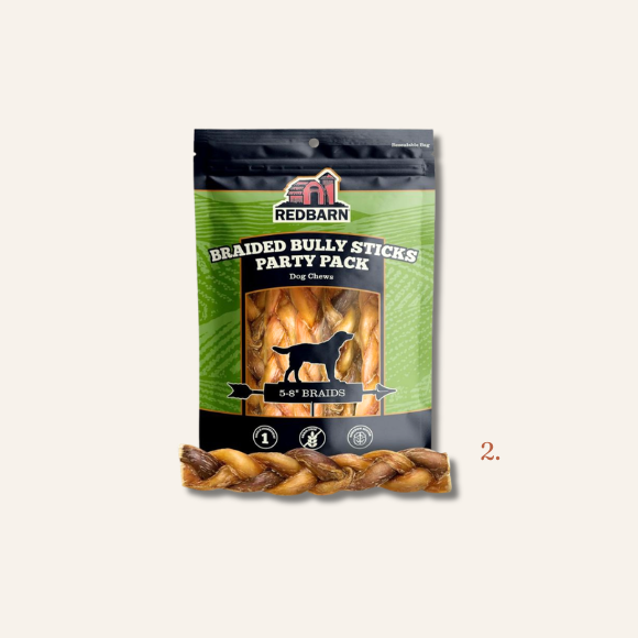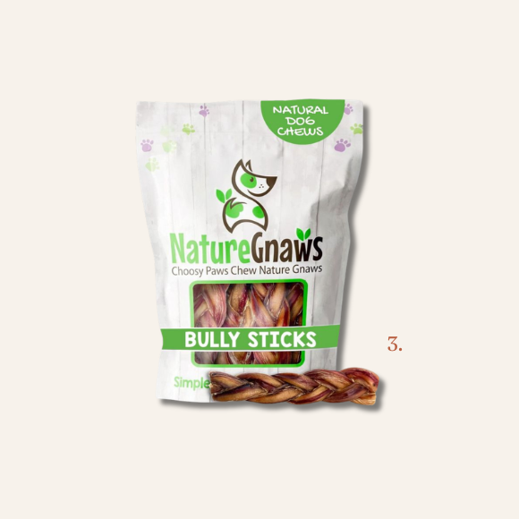 These are typically made by braiding 3 bully sticks into one form. Some dogs will separate these and eat the 3 sticks separately, while others eat the various strands as one whole. There’s no “right” way, but the strategy may affect how long the chew lasts. In theory, the thickness of the braided strands should make them longer lasting for tough chewers than a single stick. Our dogs also like the bully braids from Redbarn and Nature Gnaws.