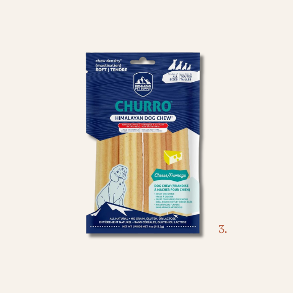 These are lactose-free cheese based and often come in multiple flavor profiles. Himalayan Pet Supply offers varying density options, and the hardest version does last quite well for tough chewers. Once the chew is too short for safety or if it starts off too hard and your dog won’t chew on it, the shapes can be soaked in water and microwaved to create more of a “cheese-puff” snack instead. These are a great option for dogs that struggle with various protein allergies or sensitivities. Our dogs also like these slightly softer options, the Yum sticks and Churro chews.