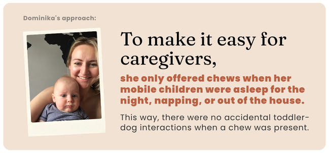 Keep baby and dog separate during chew time. Your child should not approach the dog while they're working on a chew. Feed your dog in a location a mobile child cannot access: a crate, exercise pen, behind a gate, or in the backyard.