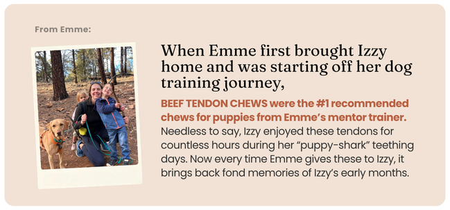 We love these for puppies and gentle chewers! A softer, natural chew option compared to bully items. Our dogs also like the tendons from Pawstruck and Natural Farm.