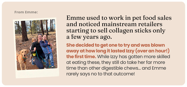 For pups (and their owners) that like variety and more novel chews, check out the Real Dog Box - a subscription-based chew and treat company that focuses on REAL food. You can expect lots of high protein options, often prepared as naturally as possible with hair and hide intact. Emme buys this for Izzy and loves seeing the always-changing menu each month.