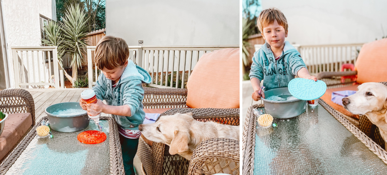 Set up a splashy soap-and-water station for washing toys and bowls - it’s sensory play with a purpose. This activity teaches responsibility and turns chores into a fun game!