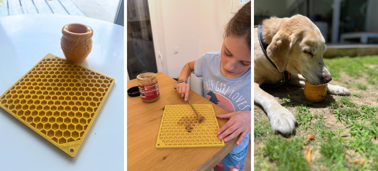 My go-to puzzle toy for grooming, bath time, and Baby TV sessions. Spread peanut butter, wet food, or yogurt on it. Pop it in the freezer for a longer challenge. Lick mats are easy to prepare, dishwasher-safe, perfect for any dog, and a great way to keep dogs occupied and calm.