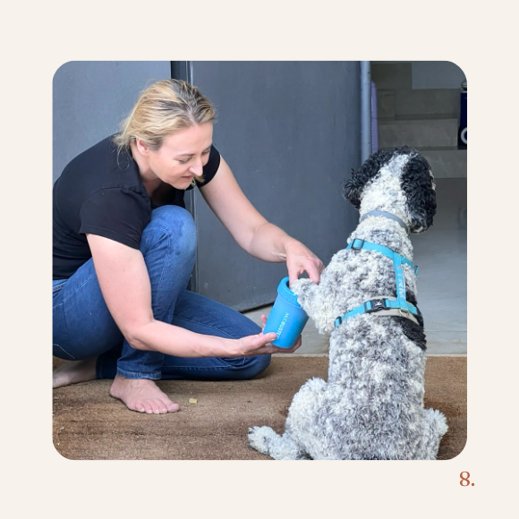 Hela’s muddy paws are no match for the MudBuster. We give her a few treats while washing her paws, then dry them on a towel. The water always comes out dirtier than you’d expect!