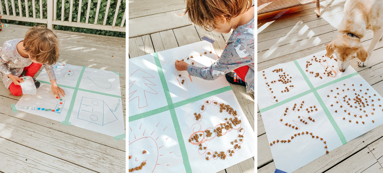 Kids create drawings, tape them to the floor, and decorate their artwork with kibble or treats. Then it’s time to invite the dog to enjoy a playful, edible art gallery! It’s a great activity to practice some number and letter recognition too.